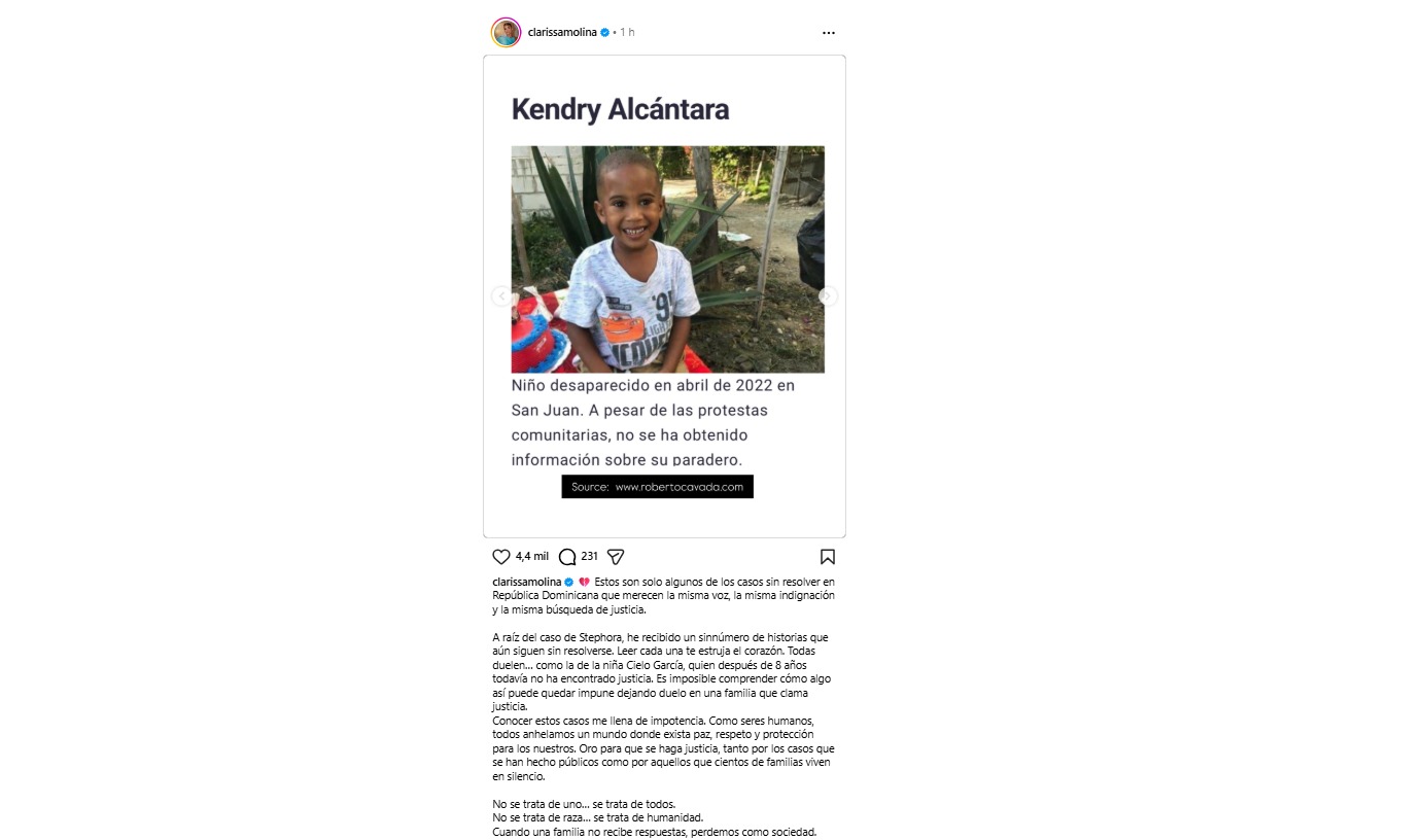 A través de su cuenta de Instagram, Molina expresó su indignación por la acumulación de expedientes estancados y la falta de respuestas para cientos de familias afectadas por hechos violentos. “Estos son solo algunos de los casos sin resolver en República Dominicana que merecen la misma voz, la misma indignación y la misma búsqueda de justicia”, escribió la comunicadora.