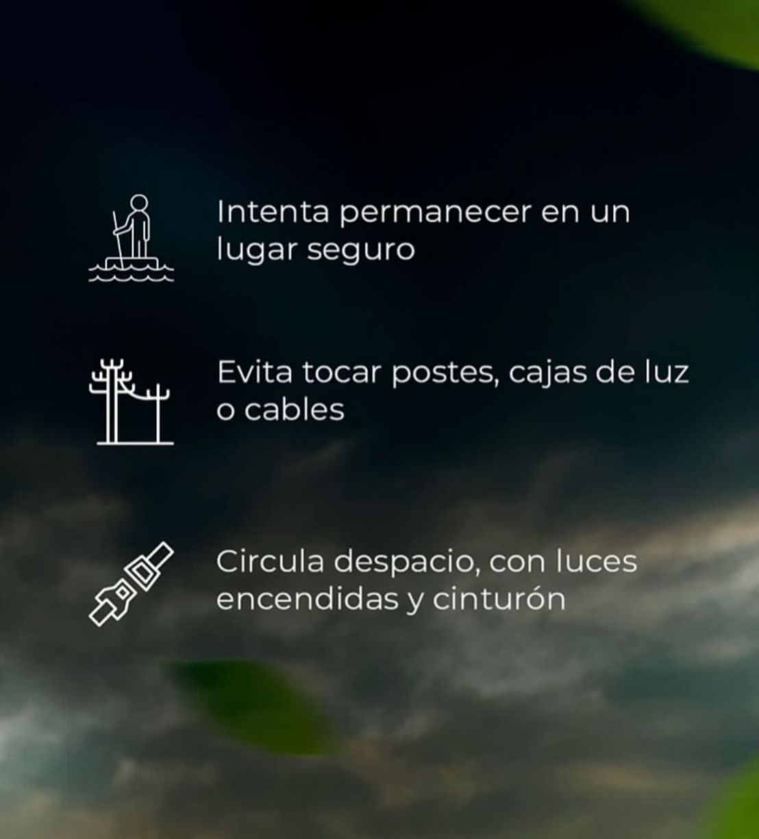 Entre las principales recomendaciones, el organismo indicó permanecer en lugares seguros y evitar el contacto con postes del tendido eléctrico, cajas de luz o cables, debido al riesgo que representan en condiciones de humedad.